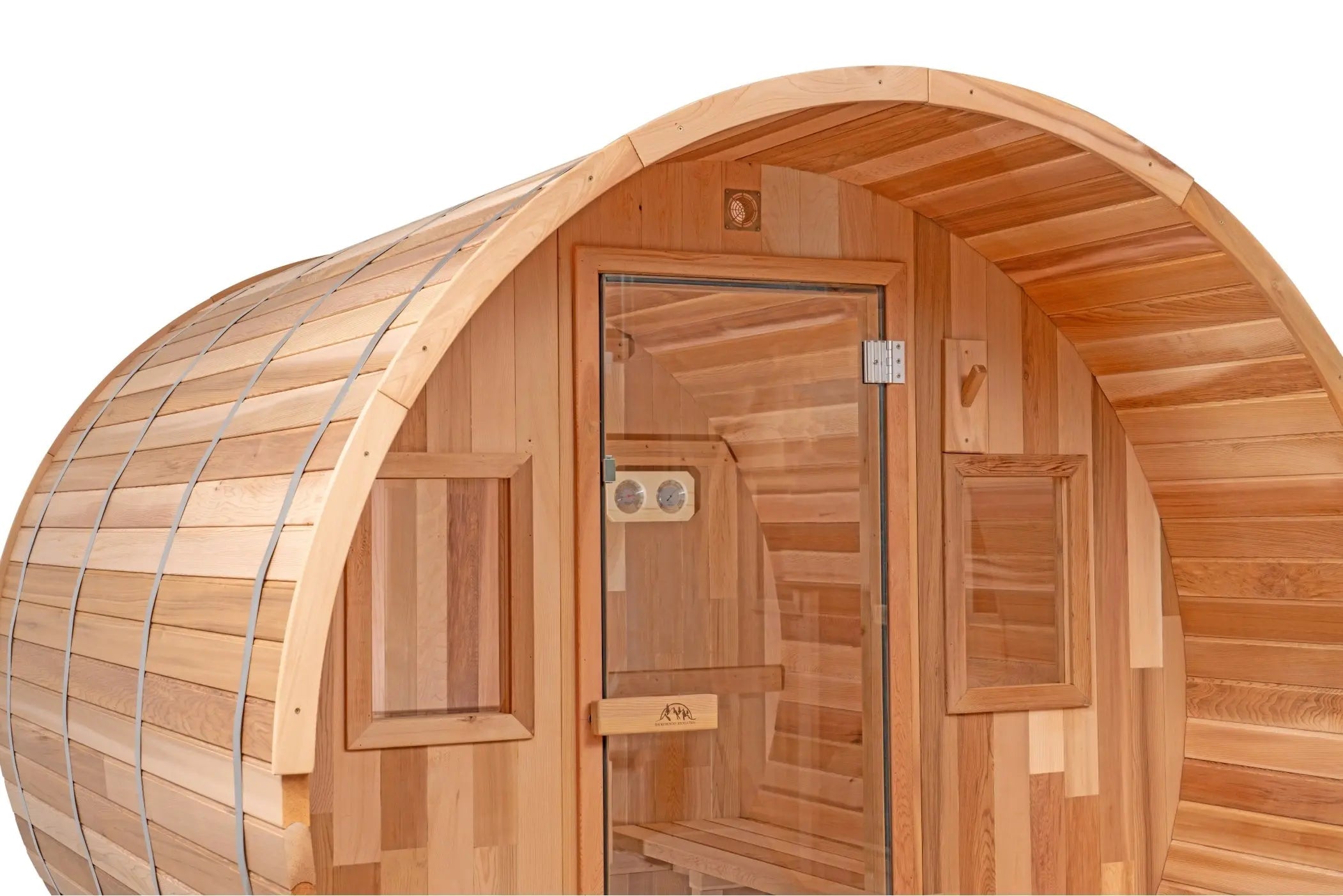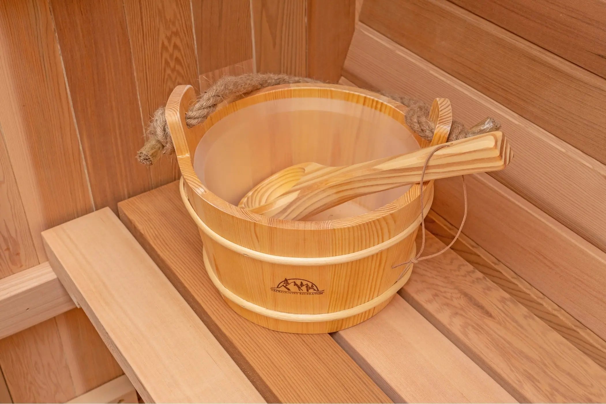 Each Backcountry Scandinavian barrel sauna kit can be paired with either a wood-fired or electric heater of your choice and includes a wooden water bucket and ladle, sauna rocks, a combination thermometer/hydrometer gauge, interior seating benches, and lighting.