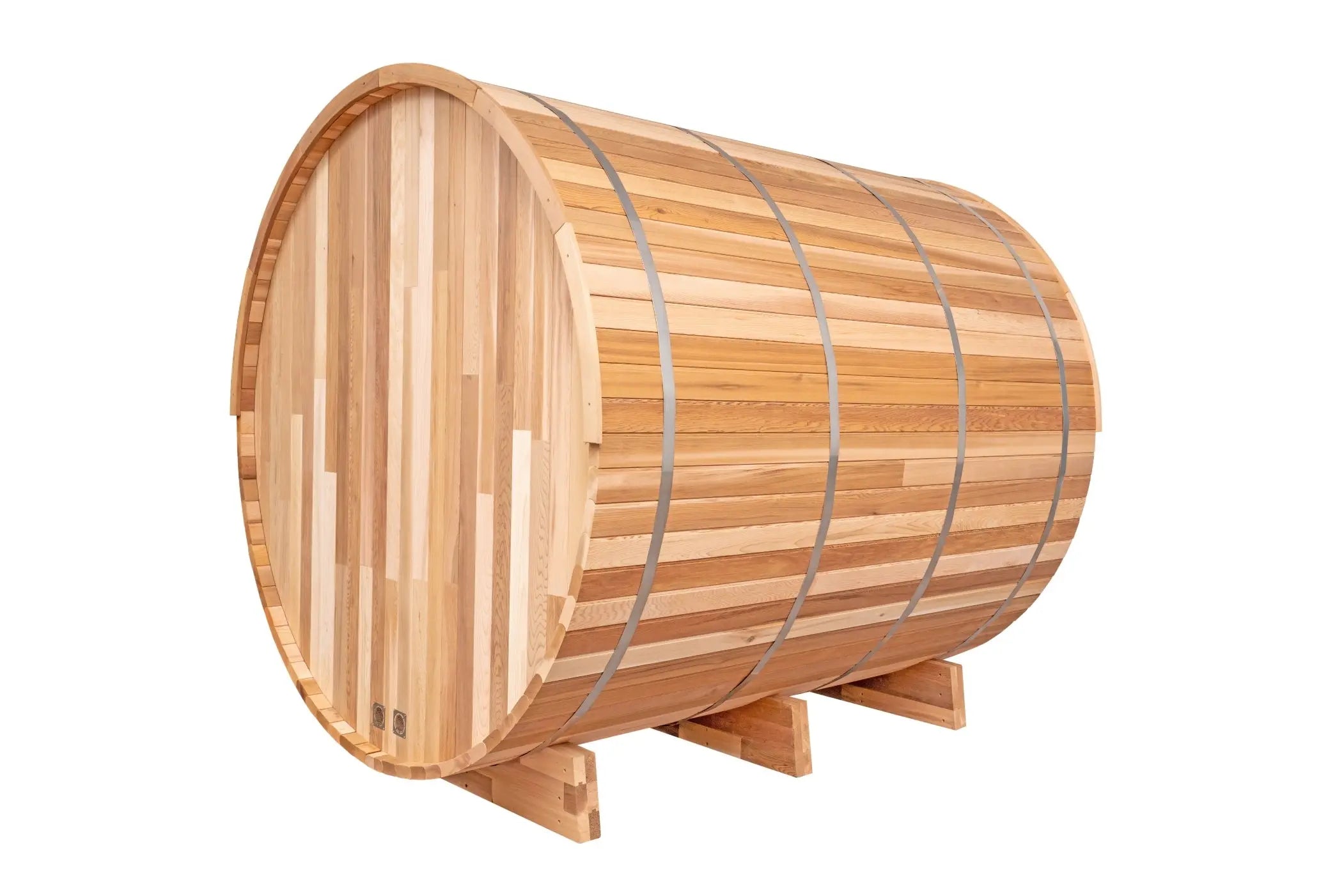 The Scandinavian barrel sauna is held in place by sturdy stainless steel bands and minimal fasteners (see photos). This system allows the lumber staves to expand and contract to form a tight seal, and the unit sits on polymer support cradles that loft the sauna’s undercarriage off the ground (see photo). The Scandinavian barrel sauna design is noted for its efficiency, even distribution of heat, and visual appeal. In addition, the front sauna porch creates a visually appealing and useful outside sitting area — a place to hold towels or drinks or to serve as a relaxing place to cool off between sauna rounds.